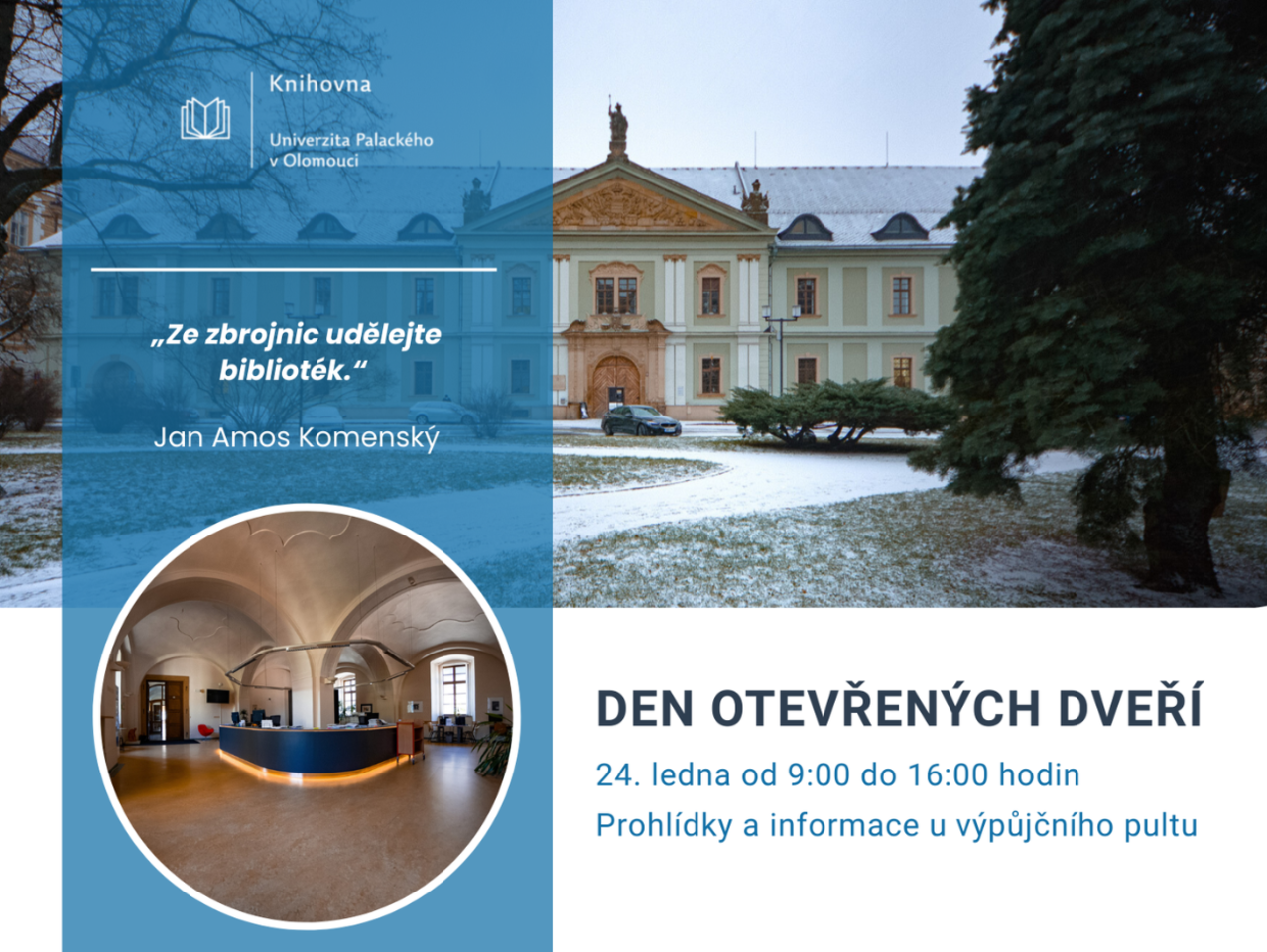 24. ledna bude knihovna otevřena k individuálním prohlídkám od 9:00 do 16:00. Zájemci o podrobnější informace se mohou obrátit na knihovníka u výpůjčního pultu.