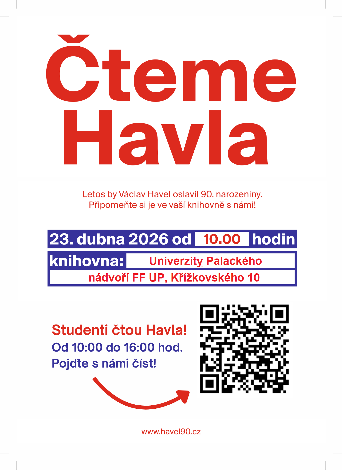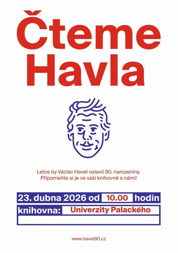 Knihovna Univerzity Palackého v Olomouci srdečně zve všechny zájemce, a především pak studenty k veřejné četbě a poslechu textů Václava Havla. Akce je pořádána ve spolupráci s Politologickým klubem UP a uskuteční se 23. dubna od 10:00 do 17:00 hod. na nádvoří Filozofické fakulty UP (Křížkovského 10).